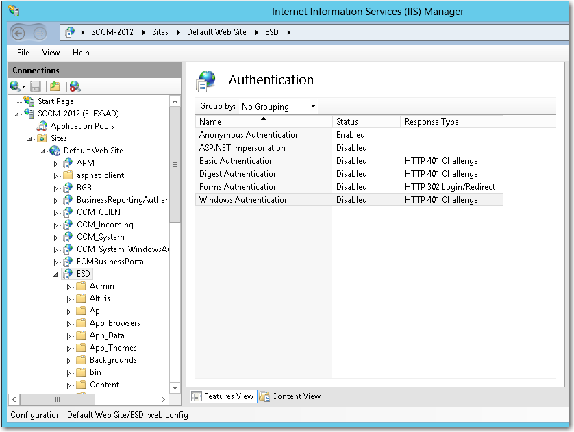 13. To configure IIS to use anonymous authentication instead of Windows authentication, perform the following steps.