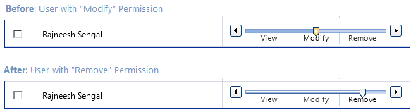 2. On each of the tabs of the Catalog Security view, adjust the user or group’s assigned rights for that role by sliding the indicator to select the desired rights, as shown in the following example: