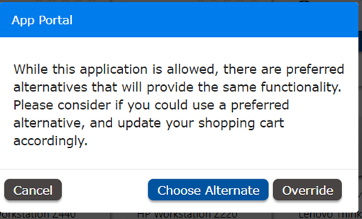 When a classification is associated to a catalog, an alert message is used to display in Browse page when the end user clicks the Add to Cart button for a Non-Preferred catalog. The user can instead choose alternate catalogs by clicking the Choose Alternate button.