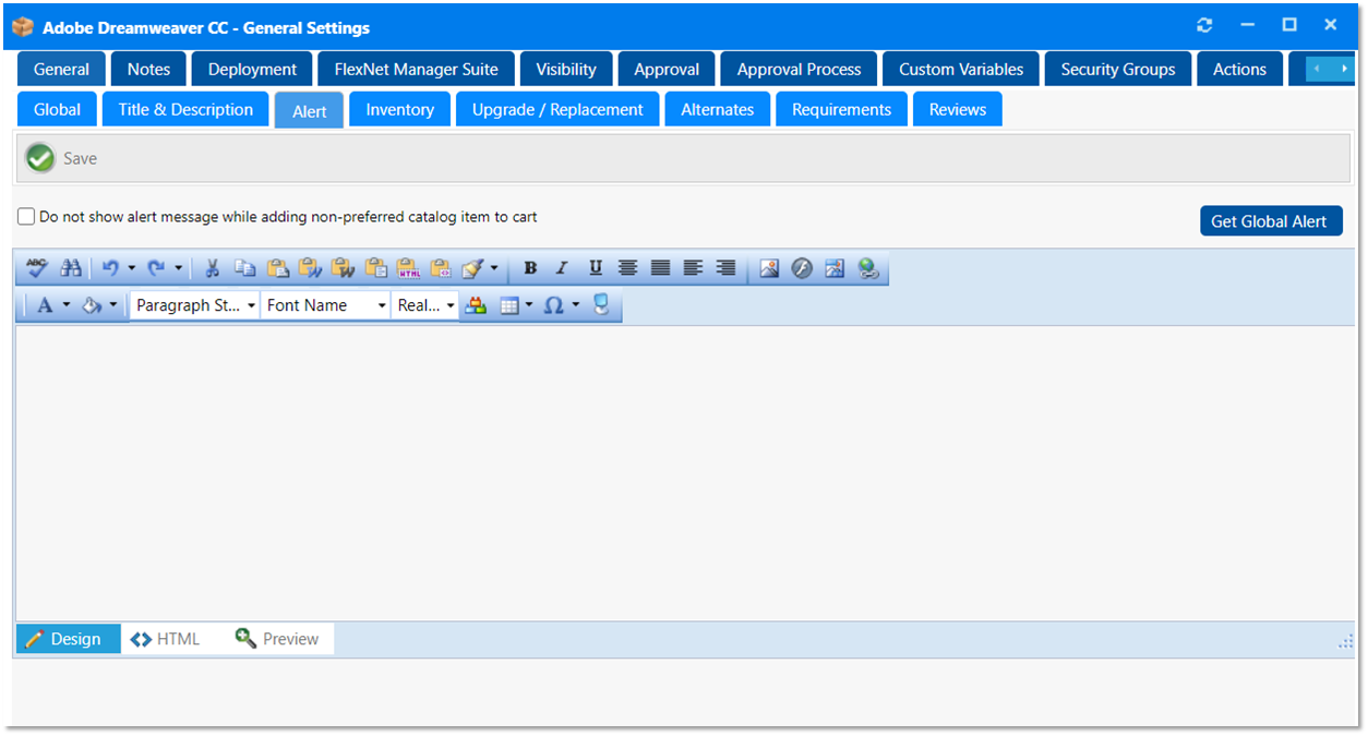 This alert tab view is only displayed for General, Software and Cloud types of catalog in the wizard and if classification is associated to the catalog. This is not applicable for Task Sequence, OSD, Group and Mobile catalogs. This view is only displayed if the Global Checkbox for Classification under Settings > Website > Catalog Classification is checked.