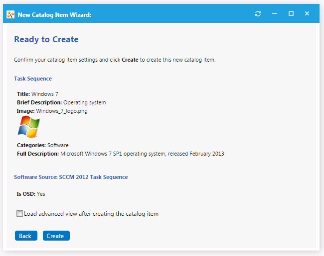 18. If, after this catalog item is created, you want to immediately open this catalog item’s Catalog Item Properties dialog box, where you can specify advanced settings, select the Load advanced view after creating the catalog item option.