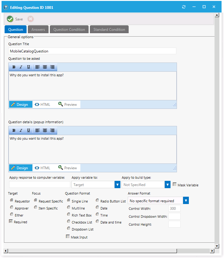 For Workspace ONE UEM mobile application catalog items, the MobileCatalogQuestionTemplate containing the MobileCatalogQuestion is always attached and cannot be removed. You cannot specify a different question template. However, you can edit the contents of the question.