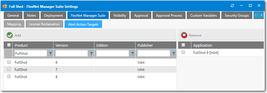 Use the filter fields in the columns to search the FlexNet Manager Suite database for the application(s) that you want to target.