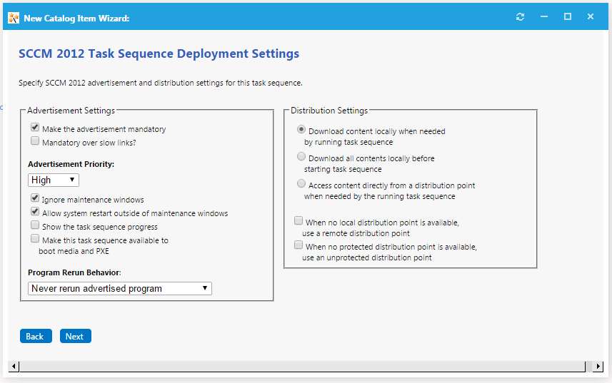 When you are finished editing the fields on the Catalog Item Title and Category panel, click Next. The SCCM 2012/ConfigMgr Task Sequence Deployment Settings dialog box opens.