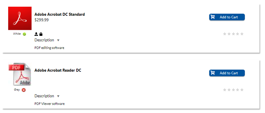 In the image above, Adobe Acrobat DC Standard is classified as White which is a Preferred type. Adobe Acrobat Reader DC is classified as Grey which is Non-Preferred type.