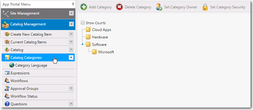 2. Under Catalog Management, select Catalog Categories. Existing categories are listed in the right pane.